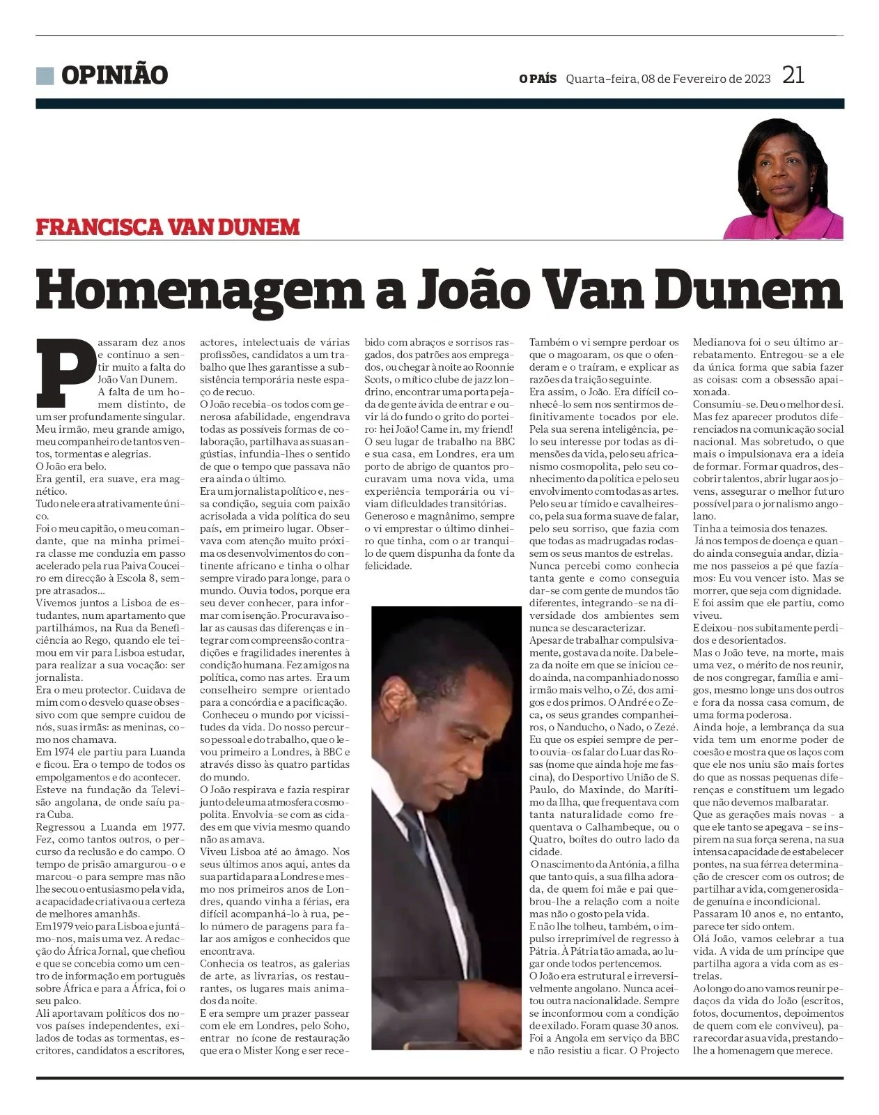 • É uma imensa tristeza, esta ausência da nossa companhia, do João VanDunem. Enquanto foi vivo tive muitas histórias vividas com ele. Enquanto, foi vivo, sempre que eu ia a Luanda, ficava em casa dele. Na nossa juventude, tivemos muitas reuniões clandestinas, eu e o seu mano Zé, que éramos os mais velhos, e o João e o meu irmão Jorge, que eram os mais novos. Tivemos muitos projectos juntos. Fizemos a ocupação da casa de Angola, em Lisboa, fizemos Rádio, escrevemos para a Radio e para Jornais. O João era uma pessoa extraordinária. Faz-me muita falta o João, agora que está a chegar a minha hora de ir ao seu encontro...